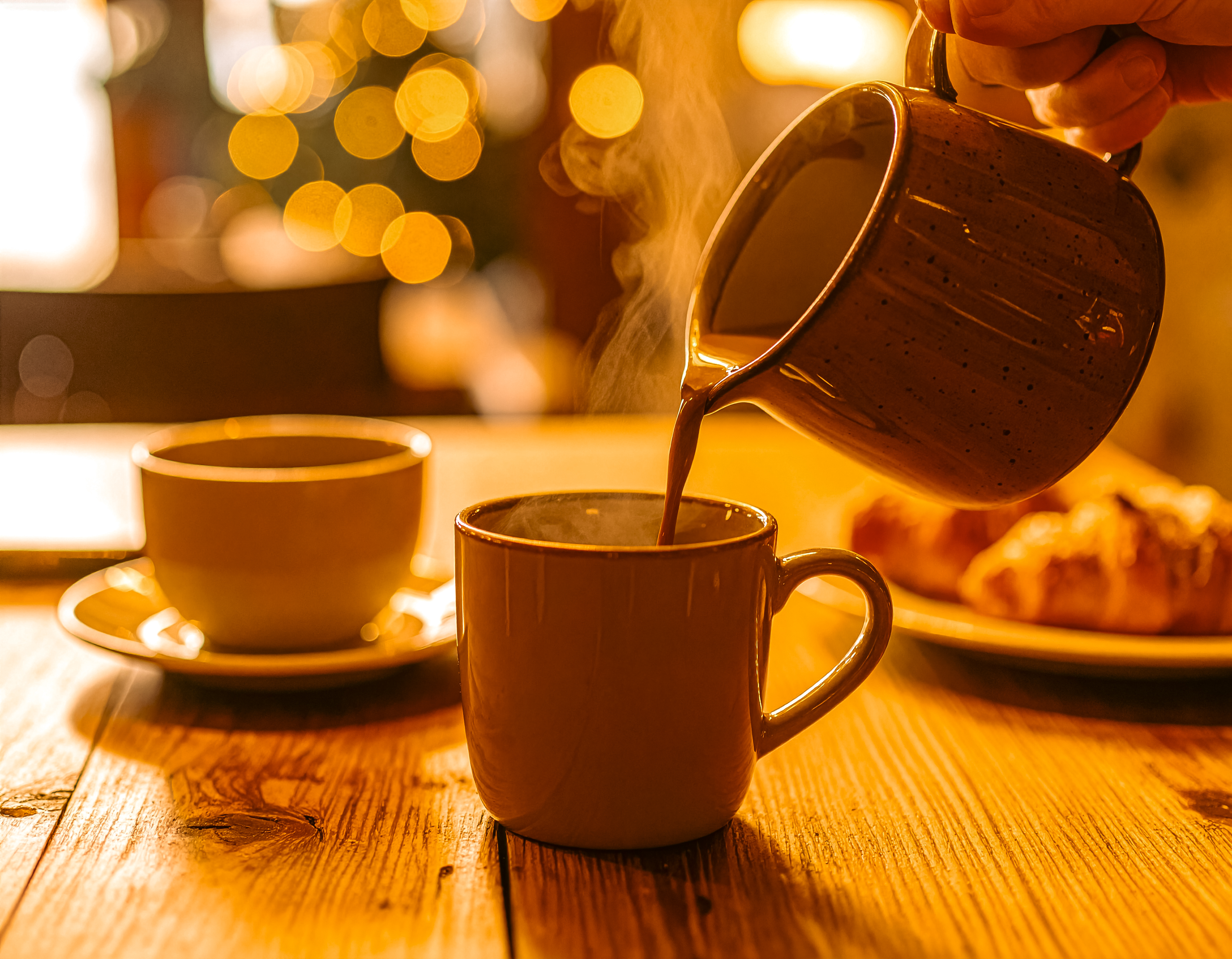 素朴な木製テーブルの上に置かれたホットチョコレートの高品質なライフスタイル写真。陶器のマグカップにはホットココアが注がれ、白い皿に盛られた職人技のペストリーの隣には湯気が立ち上っている。背景には、ミニマルでスタイリッシュなカフェのインテリア。明るく開放的なムード、ナチュラルなトーン、居心地の良いヒュッゲの美学、ココアとスイーツへのシャープなフォーカス。