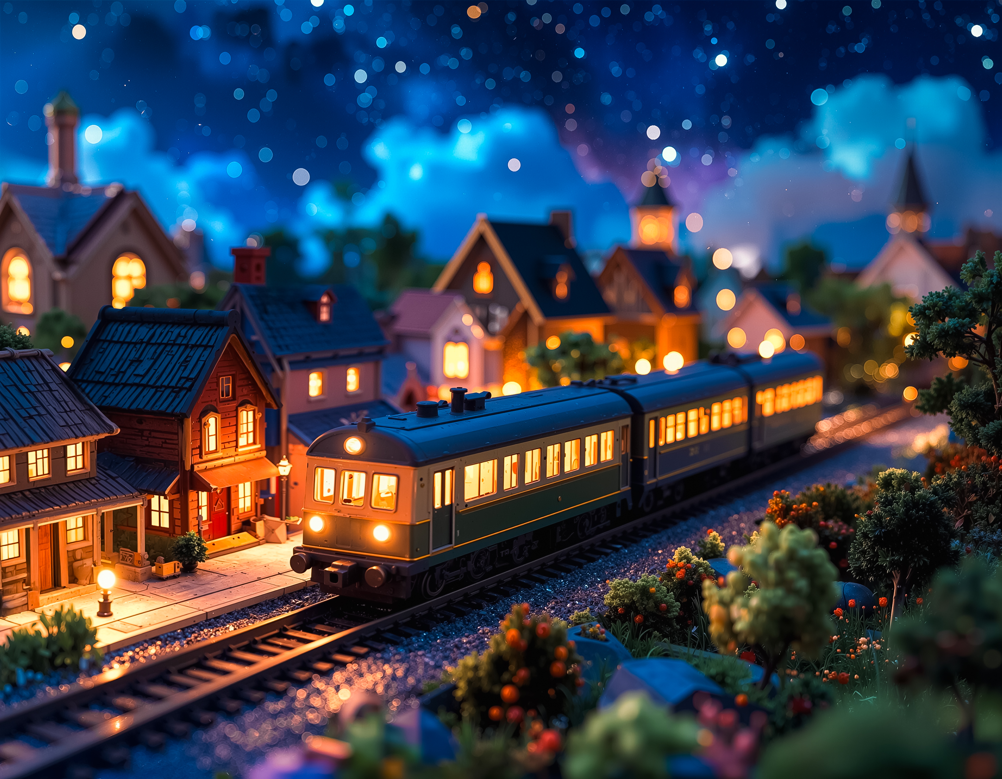 カラフルな鉄道模型 10 イラスト 2026.04.13 イラストフォトリアルAI道風景街・建物夜景 Adobe Firefly 鉄道 模型 電車 おもちゃ おもちゃ箱 線路 かわいい 緑 夜 夜景 星 光 Adobe Firefly 無料ダウンロード 素材の利用は無料です。「とりほとの素材利用規約」をお読みください。 ダウンロードした時点で規約に同意したことになります。 S800x622px M1920x1493px L2560x1991pxFULL3292x2560px Prompt : プロンプト小さな3D模型の列車が小さな街を移動している、夜、星空、—A small 3D model train moving through a small town, at night, under a starry sky,