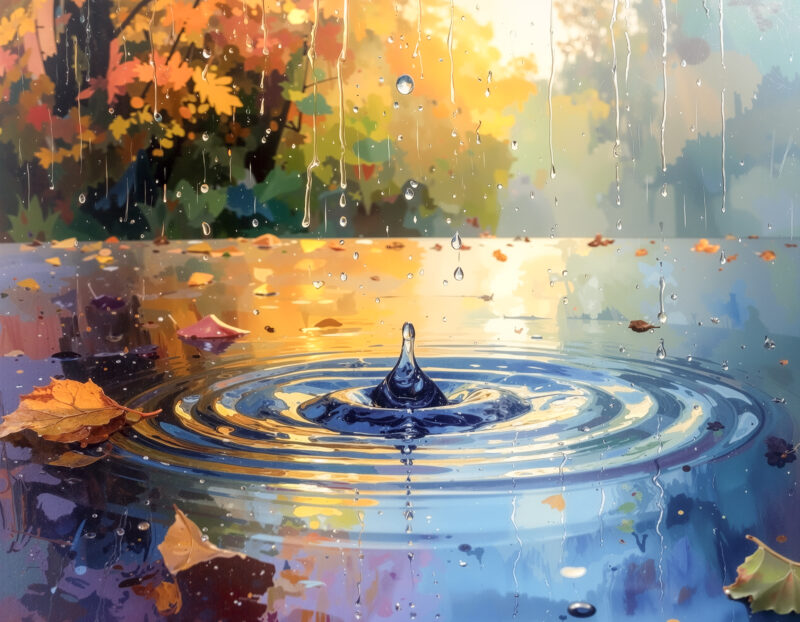 水 水滴 雨粒 波紋 しずく はねる 雨 雨天 池 落葉 枯葉 秋 樹木 イラスト 油絵風 Firefly