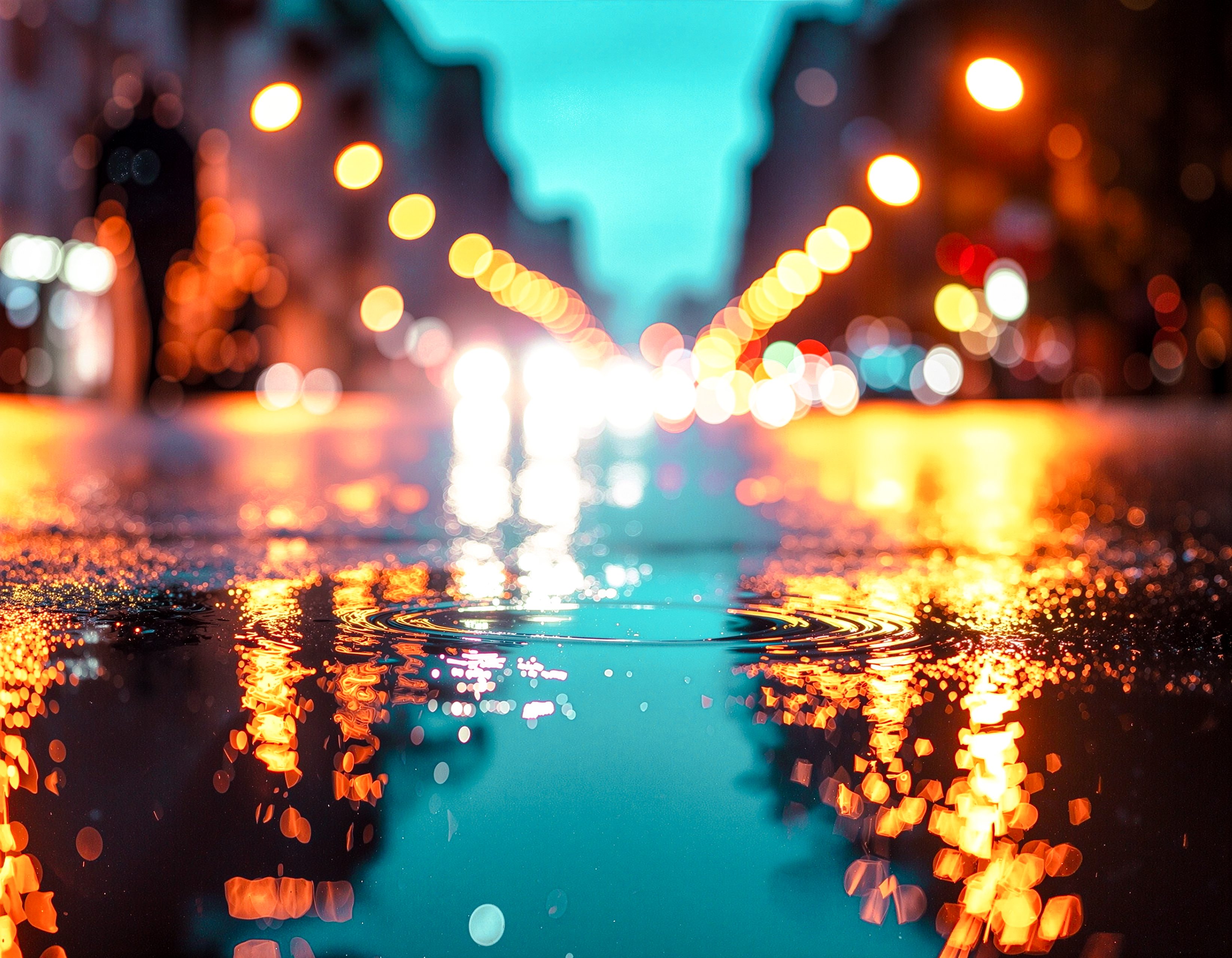 大都市の憂鬱な雨の日。地面の水たまりに広がる波紋に焦点を当てた一枚。水面に映る光景、暗く濡れた舗道。ティールとオレンジを基調とした色調。遠くの街の明かりが通りを照らし出している。物悲しくも美しい雰囲気。傑作と呼ぶにふさわしい、芸術的な写真スタイル。