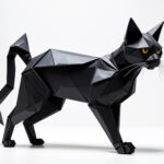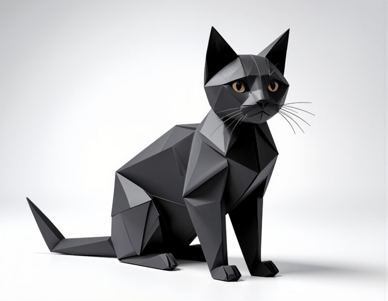Black origami cat, white background